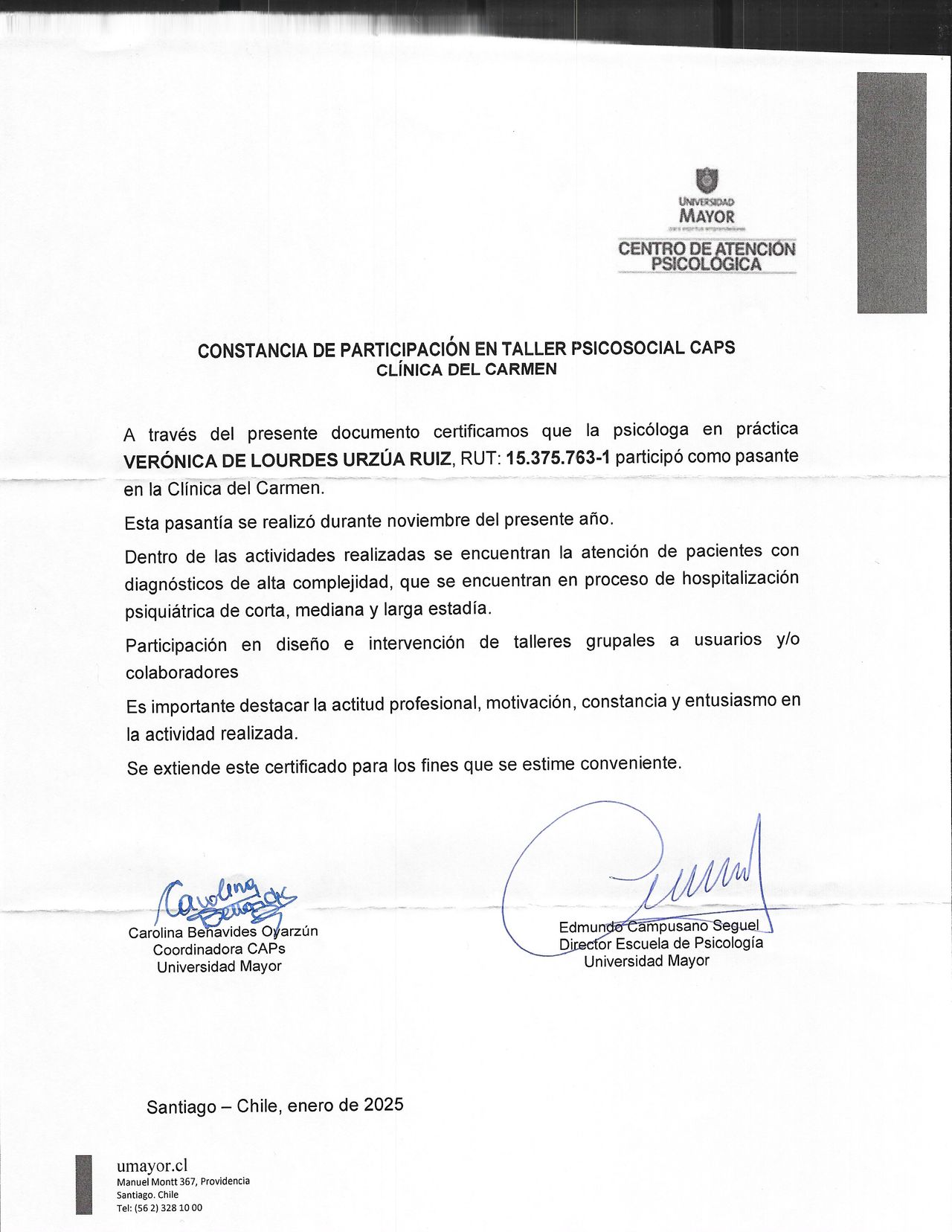 Hola! Soy Vero y me he formado en terapia con enfoque sistémico y en terapia desde el enfoque cognitivo conductual, tengo experiencia en evaluación diagnóstica y terapia. Me oriento a pacientes que busquen trabajar en temáticas como depresión, ansiedad, crisis normativas, autoestima, entre otras. Lo que me distingue en el espacio terapéutico es la terapia centrada en el paciente, y la terapia breve enfocada al malestar psicológico.